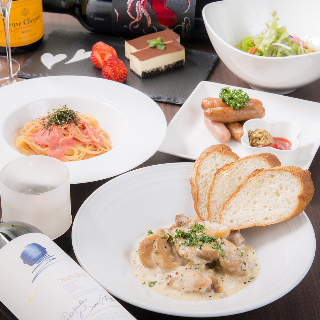 Course Meal コース料理 乾杯に季節のフルーツカクテル!2時間飲み放題付き 1杯目に季節のフルーツカクテルをご提供!バーの本格的なカクテルが2時間飲み放題の女子会向けプランです。 お料理もお酒に合うようにおつまみやメインなどをご用意しております。〆にはデザートをどうぞ! Menu 1.おまかせサラダ 2.ソーセージ盛り合わせ 3.鶏肉の粒マスタード煮込 4.タラコパスタ 5.本日のデザート 1杯目に季節のフルーツカクテルをご提供! 2時間飲み放題付きの女子会向けプランです。 コース料金 5,500円(税込)*span> 対応人数 2~35名 予約締切 来店希望日の2日前23時まで 予約可能曜日 月〜日・祝前日・祝日 飲み放題メニュー [ ジンベース ] ジントニック、ジンリッキー、ジンバック、ジンライム、トムコリンズ、シンガポールスリング、ネグローニ、マティーニ、ボンドマティーニ、ギムレット、ホワイトレディー、パリジャン、ブルームーン、アラスカ、オレンジブロッサム、アラウンドザワールド [ ウォッカベース ] ウォッカトニック、スカイボール、フロリダトワイライト、モスコミュールスクリュードライバー、ブッラックルシアン、ソルティードッグ、ブラッディーメアリー、ゴッドマザー、カミカゼ、スレッジハンマー、バラライカ、雪国、コスモポリタン [ ラムベース ] ラムニック、ラムリッキー、ソルクバーノ、キューバリバー、カイビリーニャ、ボストンクーラー、モヒート、ダイキリ、XYZ、スカイダイビング、バカルディー、ネパダ、クウォーターデッキ [ テキーラベース ] テキーラトニック、テキーラリッキー、テキーラバック、テキーラサンライズ、マタドール、エルディアブロ、アンバサダー、マルガリータ、ブルーマルガリータ、シルクストッキング、テキーニ [ ウィスキーベース ] オリジナルブレンドハイボール、ジンジャーハイボール、コークハイ、ゴッドファーザー、ラスティーネイル、ジョンコリンズ、ウイスキーサワー、ミントジュレッブ、マンハッタン、ロブロイ、ニューヨーク、ハンター [ ブランデーベース ] フレンチコネクション、ホーセズネック、ブランデーサワー、カルバドスニック、カルバドスクーラー、サイドカー、ジャックローズ、アレキサンダー、チェリーブロッサム、スティンガー、ビトウィンザシーツ [ リキュールベース ] カシスオレンジ、カシスソーダ、カシスウーロン、スプモーニ、カンパリソーダ、キヒオレンジ、キヒトニック、チャイナブルー、ファジーネーブル、ピーチウーロン、パッソアサンライズ、照葉樹林、カルーアミルク、マリブパイン、マリブコーラ、シャンボールトニック、シャルトリューズトニック [ リキュールベース ] スカーレットオハラ、グラスホッパー、金閣、バレンシア、ゴールデンキャデラック、オーガズム、ベルベットハンマー [ ビアベース ] シャンディーガフ、レッドアイ、ビアスプリッツァー、カシスビアー、ワインクーラー、キール、スプリッツァー、アメリカーノ、アメリカンレモネード、バンブー、アドニス [ ノンアルコールカクテル ] サラトガクーラー、スーパーサラトガクーラー、バージンスカイボール、バージンフロリダトワイライト、シャーリーテンプル、バージンブリーズ、シンデレラ
